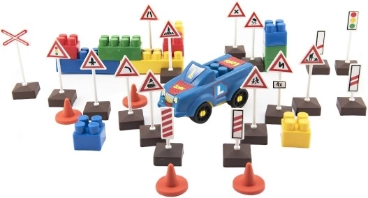 Juego de construcción Autoescuela ofrece diversión y aprendizaje en uno. Incluye 16 señales de tráfico, 2 conos y un coche, ideal para desarrollar las habilidades de los niños.