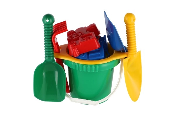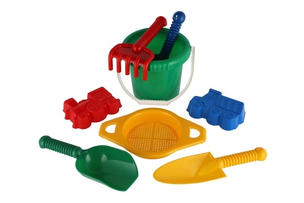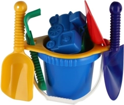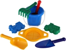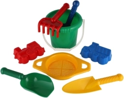 Incluye todas las herramientas necesarias para construir y jugar de forma creativa en la arena: cubo, tamiz, palitas, rastrillos y dos moldes.