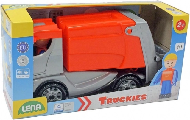 Divertido camión de basura de la línea Lena Truckies para niños a partir de 2 años que ofrece estructura sólida, funcionalidad totalmente mecánica y plástico resistente. Incluye cabina abatible con figura de conductor y contenedor trasero para un juego realista de recogida de residuos, ideal para desarrollar la imaginación y la motricidad fina.