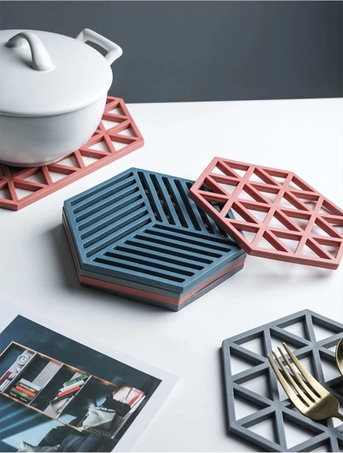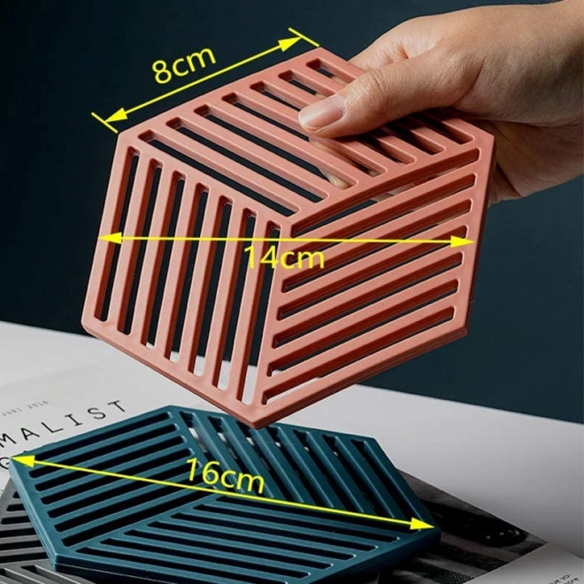 Este resistente salvamanteles de silicona está diseñado para el uso diario: sostiene con seguridad ollas, sartenes y fuentes calientes, y al mismo tiempo protege las superficies de trabajo contra daños por calor o arañazos. El diseño minimalista en forma de hexágono con cortes diagonales aporta un aire moderno a tu cocina.