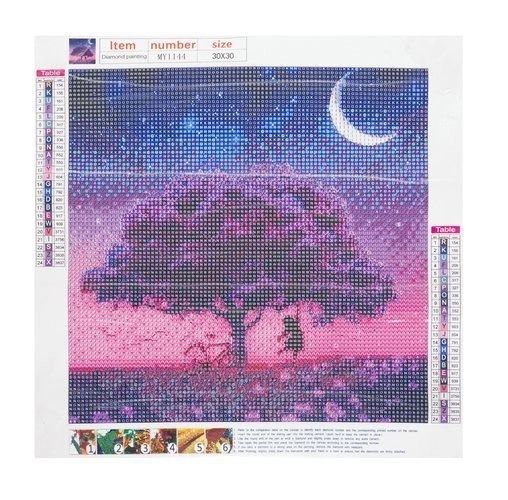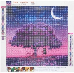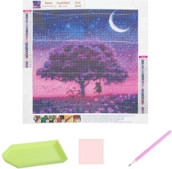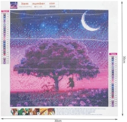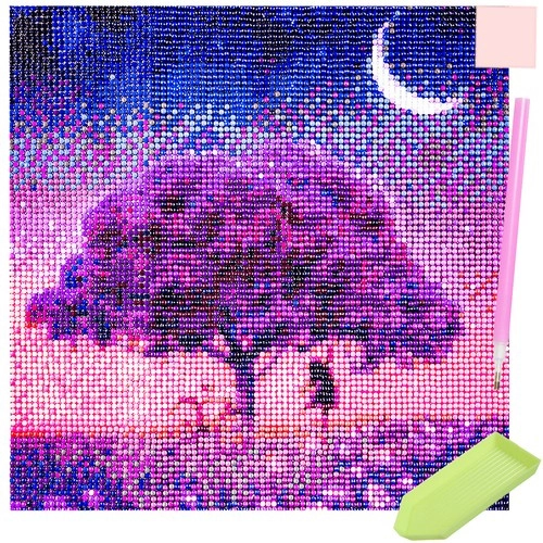 El motivo del árbol en tonos rosa‑violeta con media luna crea un encantador efecto brillante que destaca enmarcado o sin marco. La pintura de diamantes es ideal para calmar la mente, desarrollar la motricidad fina y la creatividad, adecuada para principiantes y avanzados.