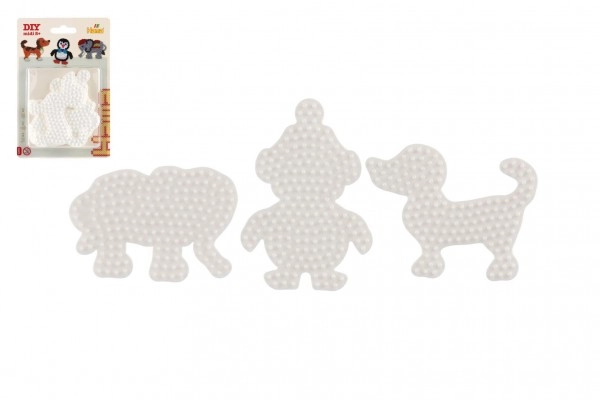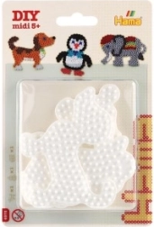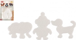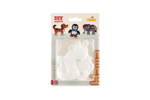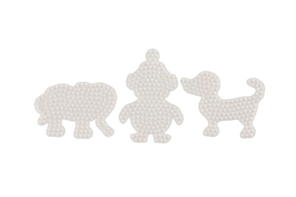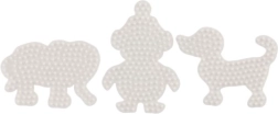 El set de plantillas Hama para cuentas termoadhesivas permite a los niños a partir de 5 años crear imágenes coloridas gracias a las bases de plástico blancas con forma de elefante, pingüino y perrito.