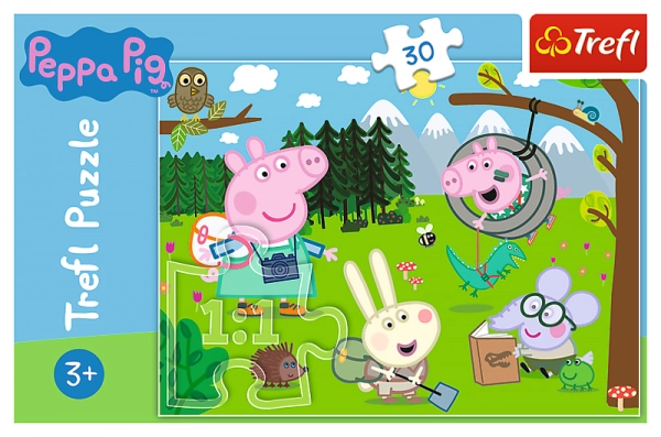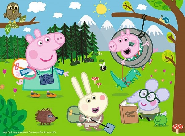 El rompecabezas Expedición en el bosque de Peppa Pig está inspirado en la popular serie animada infantil Peppa Pig. Este gran rompecabezas de cartón grueso está diseñado especialmente para los más pequeños. Los colores vivos y los bonitos diseños de los animalitos motivan a los niños a jugar.