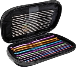 El estuche compacto de piel sintética mantiene todas las herramientas juntas y permite transportarlas fácilmente. El compañero ideal de viaje, ya sea que tejas en el coche o en el tren.