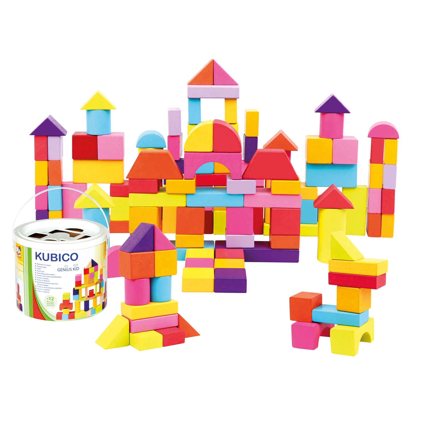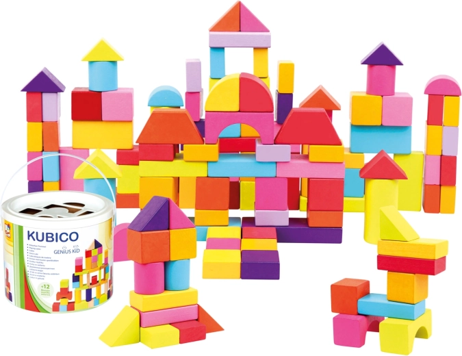 Este completo set de bloques de madera en nuevos colores ofrece a los niños infinitas posibilidades para construir torres, puentes y estructuras sencillas. El práctico embalaje en un cubo de cartón facilita el guardado y el transporte, mientras que la tapa con aberturas funciona como clasificador para ejercitar la lógica y la paciencia.