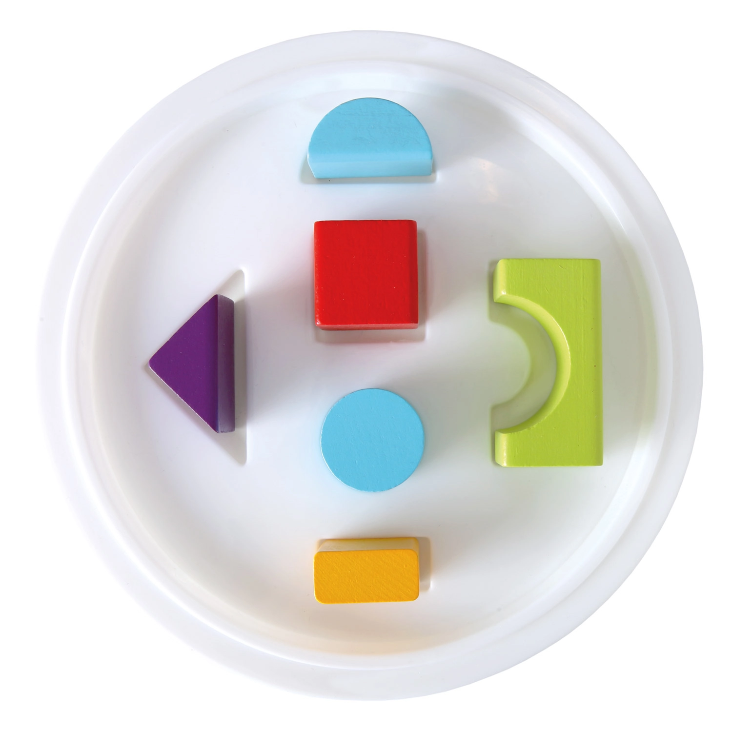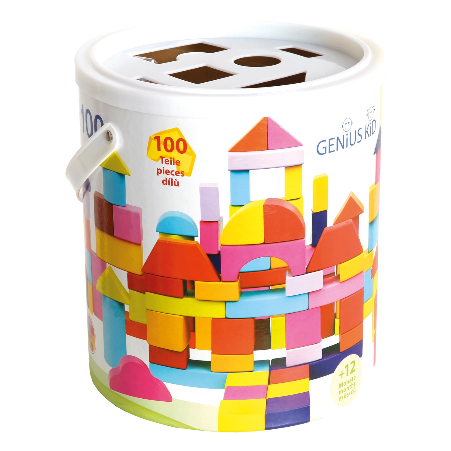 El empaquetado convierte la tapa del cubo en un clasificador de formas. Así, los niños practican de forma natural el reconocimiento de formas, la coordinación y el pensamiento lógico mientras guardan los bloques.