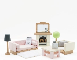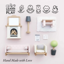 El set incluye 19 piezas: sofá y sillón con cojines de tela, mesa de centro, chimenea con leños y espejo, alfombra, planta en maceta y lámpara. Su tamaño es adecuado para las casas de muñecas de Le Toy Van. Más accesorios de la serie Daisylane están disponibles en nuestro sitio web.
