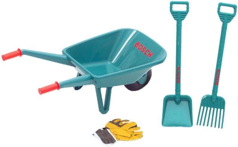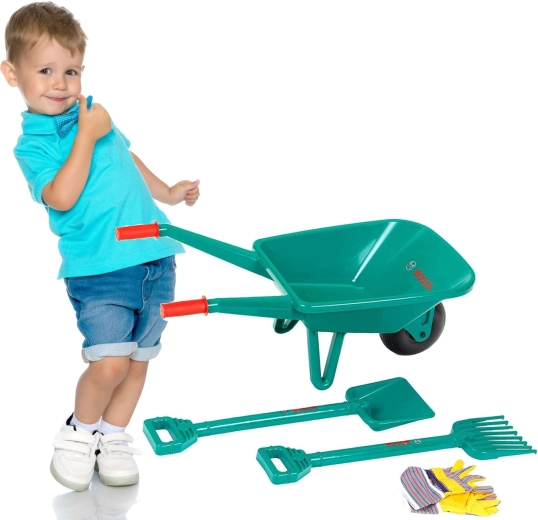 Descubra el divertido juego de jardinería para niños con licencia de BOSCH de la marca Klein: carretilla de plástico ligera, pala, rastrillo y guantes infantiles para jugar en el jardín con seguridad. Ideal para transportar arena, hojas y para desarrollar la motricidad y la imaginación.