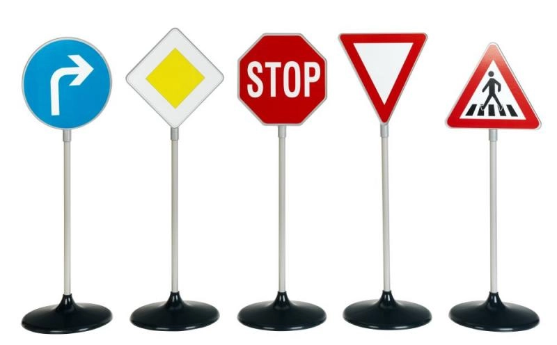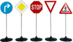 El set incluye cinco de las señales más utilizadas (p. ej., STOP, Ceda el paso, Carretera principal, Dirección obligatoria, Paso de peatones) y ayuda a los niños a asimilar rápidamente las normas básicas.