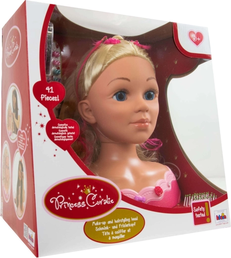 La cabeza para peinar PRINCESS CORALIE encantará a todas las pequeñas estilistas. Su cabello realista, largo y fácil de peinar, los ojos azules y la base rosa estable garantizan comodidad y diversión al crear peinados y maquillajes. El completo set con cepillo, peine, horquillas, cuentas y una paleta de maquillaje infantil abre un mundo de imaginación.