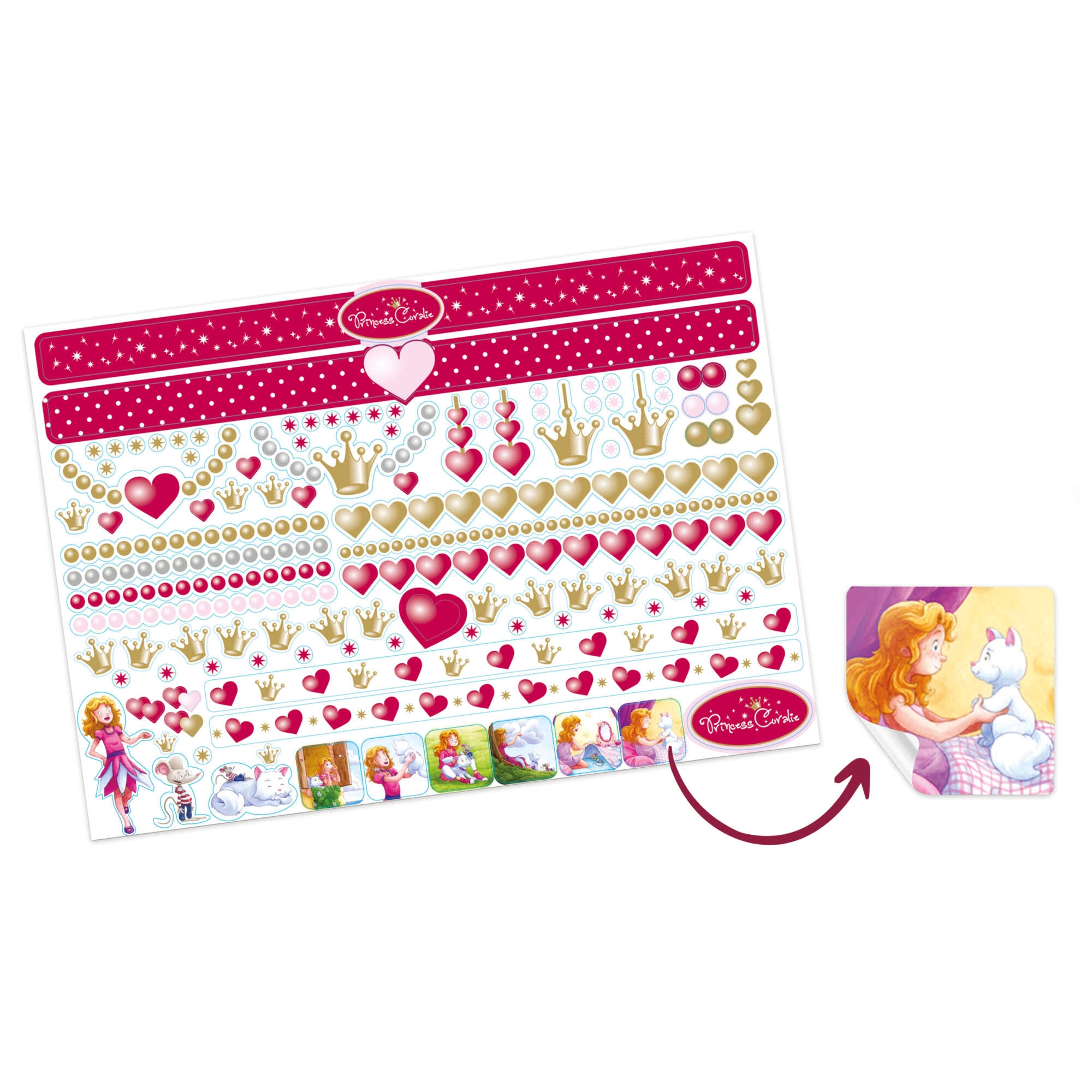 Incluye una paleta compacta con sombras, brillo labial y aplicadores para un maquillaje lúdico PRINCESS CORALIE. Todo está diseñado para el juego infantil.