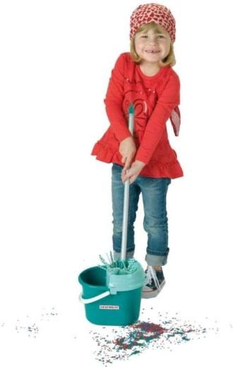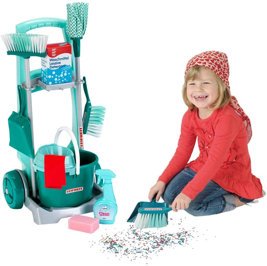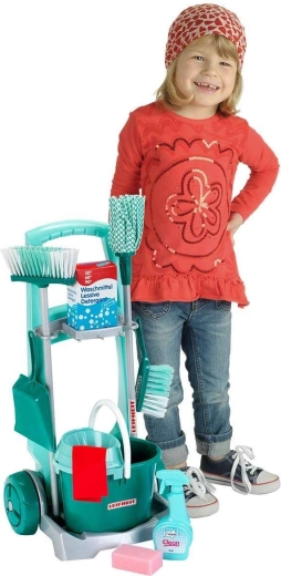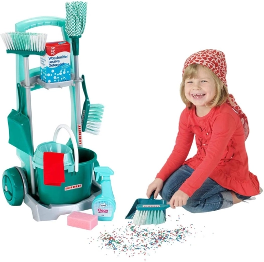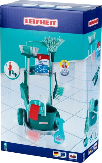 El set de limpieza infantil con licencia oficial LEIFHEIT luce como un equipo real, pero está adaptado de forma segura para pequeños ayudantes. El robusto carrito con ruedas tiene soportes para herramientas, una repisa para el cubo y espacio para la cajita de “detergente”, para que los niños se sientan como en una limpieza de verdad.