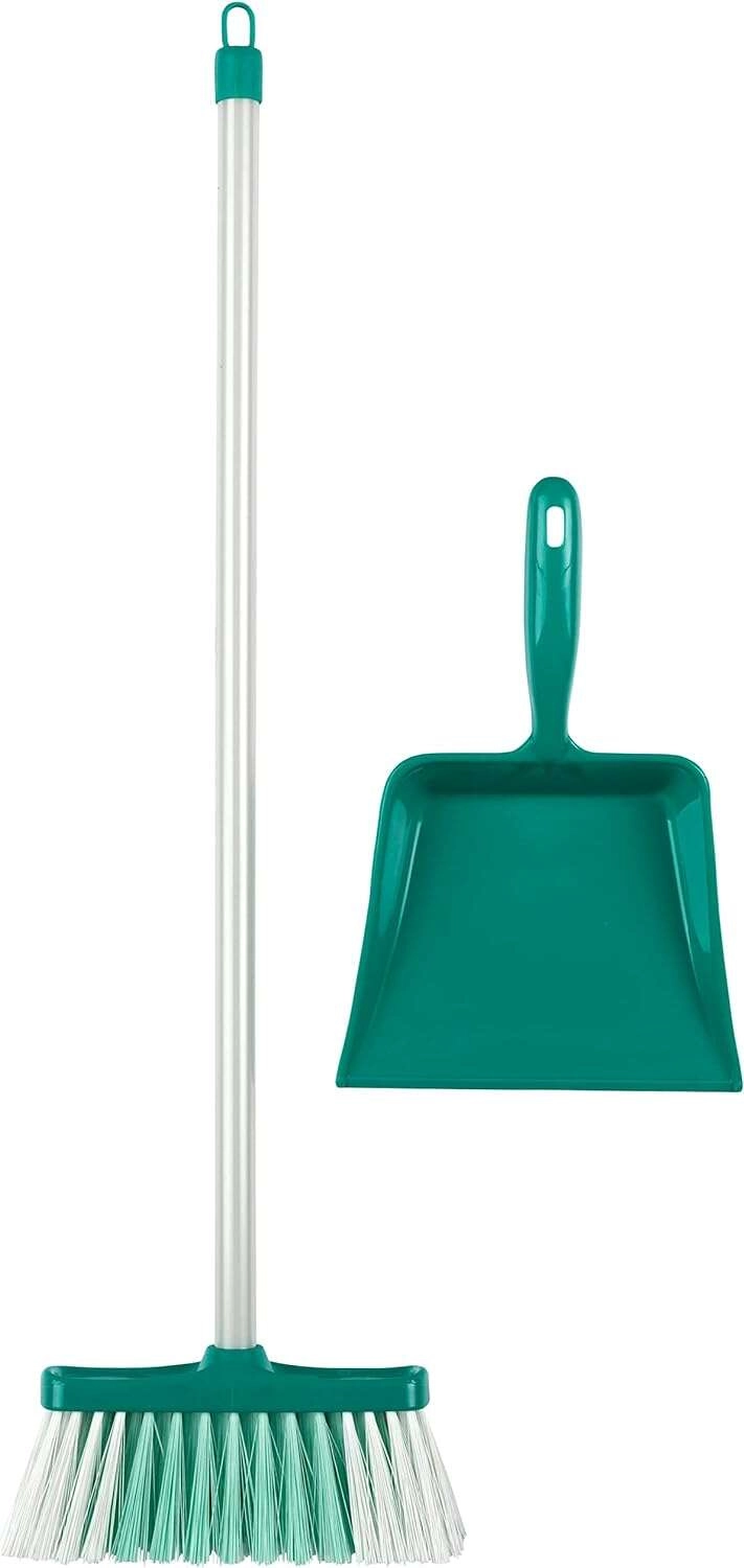 El palo largo de la escoba y las cerdas suaves permiten a los niños imitar el barrido con seguridad. El cepillo de mano con recogedor ayuda a “recoger” migas y polvo.