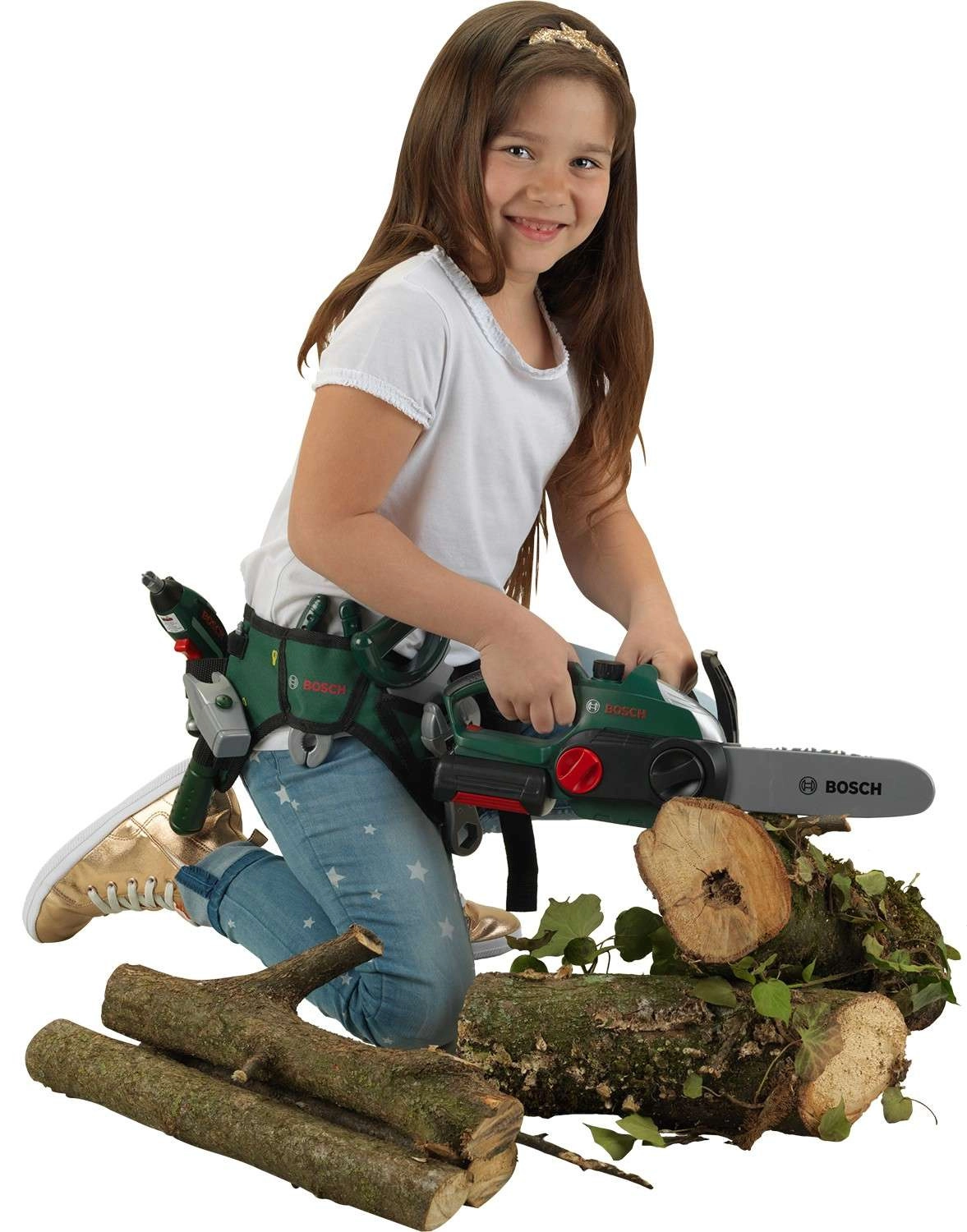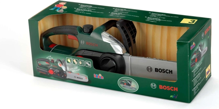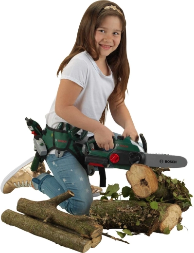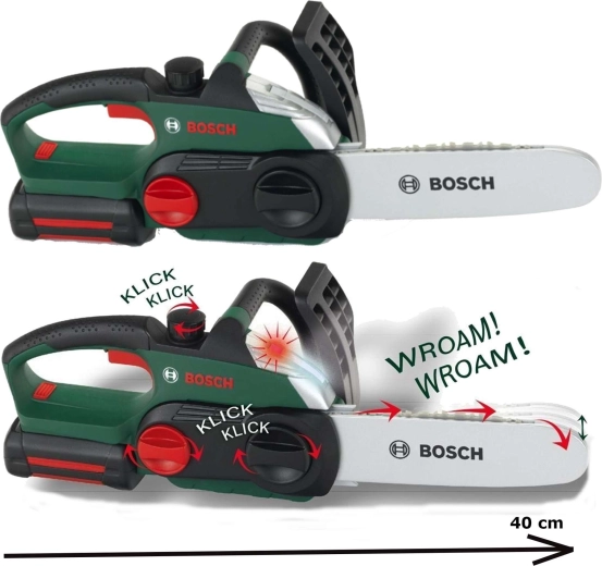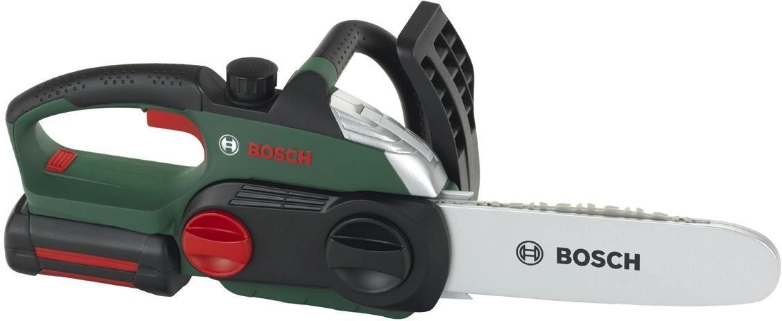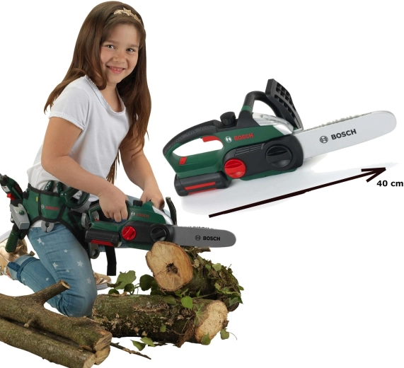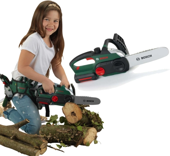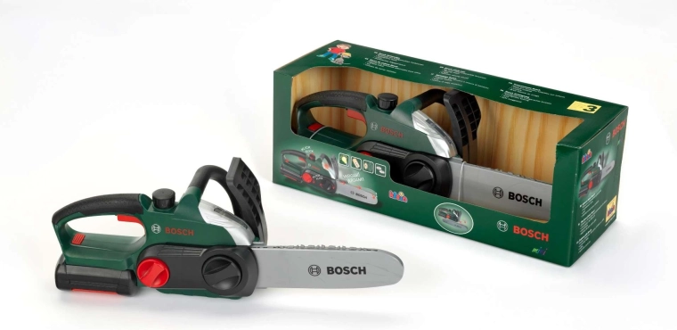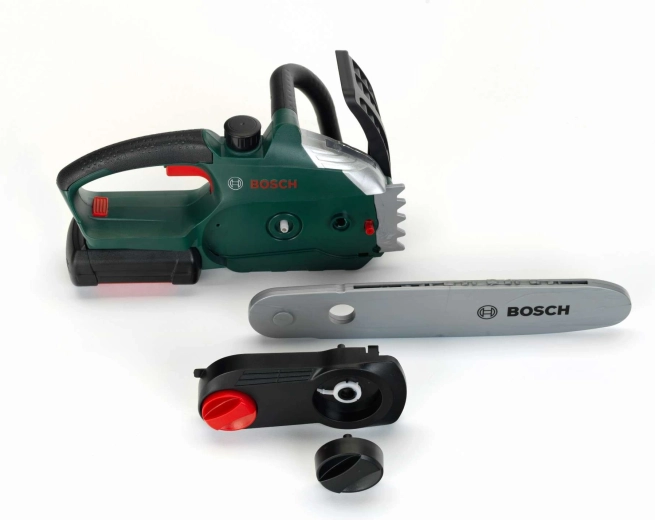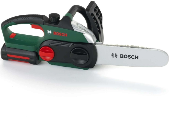 Esta sierra de cadena inalámbrica para niños imita fielmente la herramienta real de BOSCH, incluido el acabado en verde oscuro con detalles rojos y plateados. Está fabricada de forma sólida y con atención al detalle, para que los niños disfruten de un juego de leñador o jardinero con total seguridad.