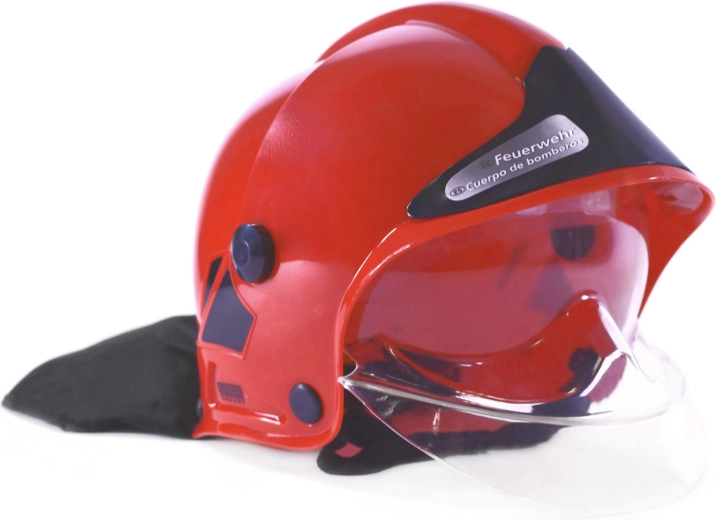Este casco de bombero infantil en color rojo es una réplica con licencia de MSA, diseñada para un juego seguro y creativo. La visera abatible integrada protege el rostro, mientras que la cortinilla negra en la nuca imita el equipo profesional y aporta mayor realismo al juego.