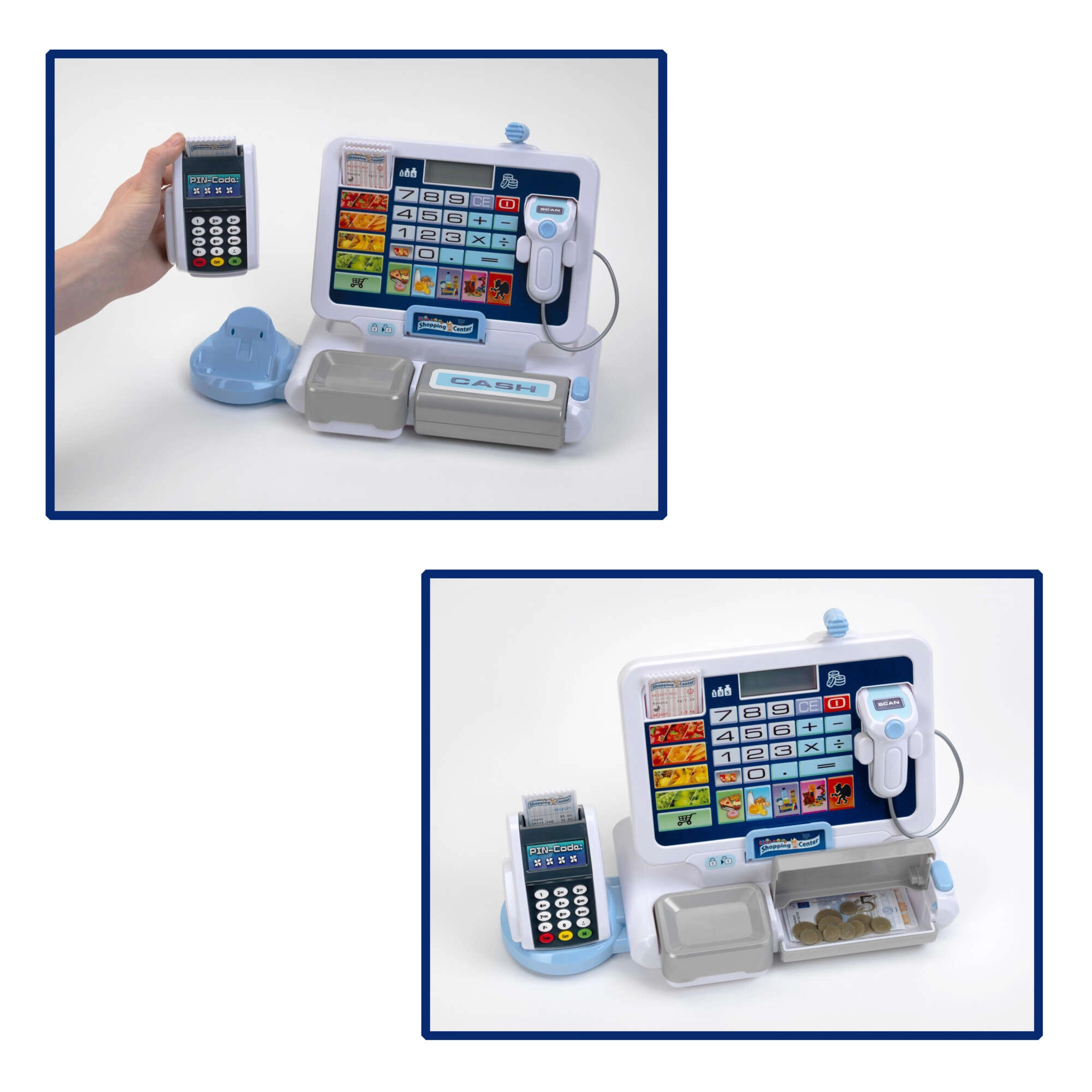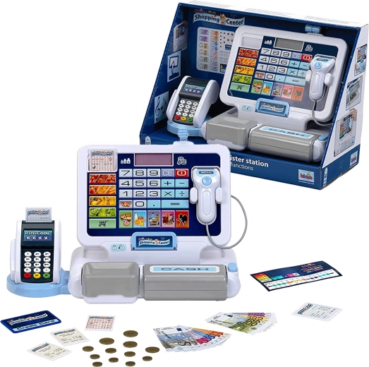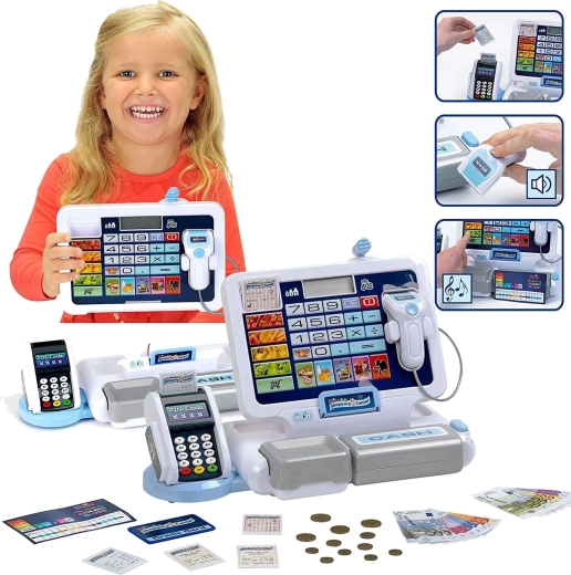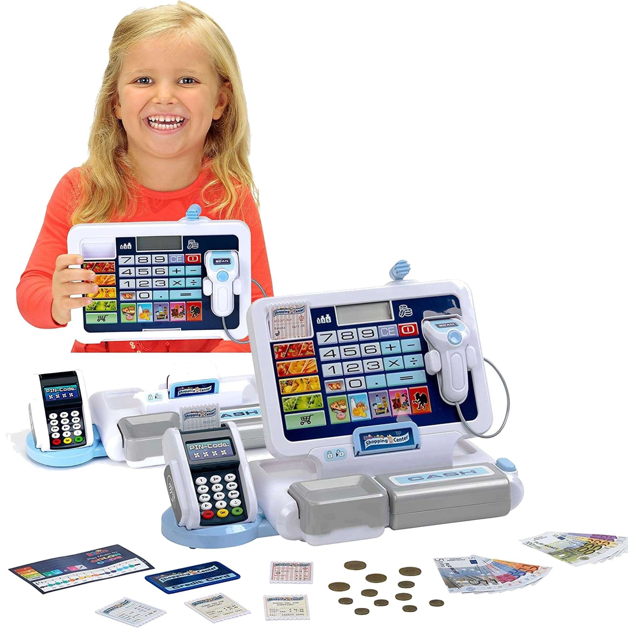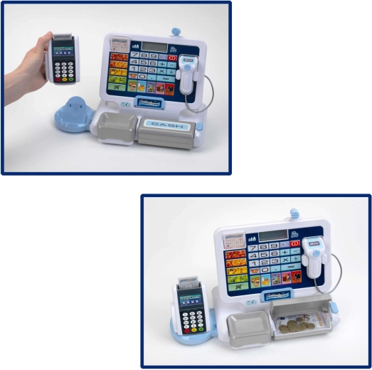 La caja registradora infantil realista con terminal y escáner de la marca KLEIN aporta un juego de tienda auténtico. Ofrece pantalla funcional con calculadora, cajón para dinero abatible, lector de tarjetas, efectos de sonido y abundantes accesorios, incluidos monedas y billetes en euros, recibos y una tarjeta “de crédito”, ideal para desarrollar cálculo, educación financiera y juego de roles.