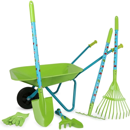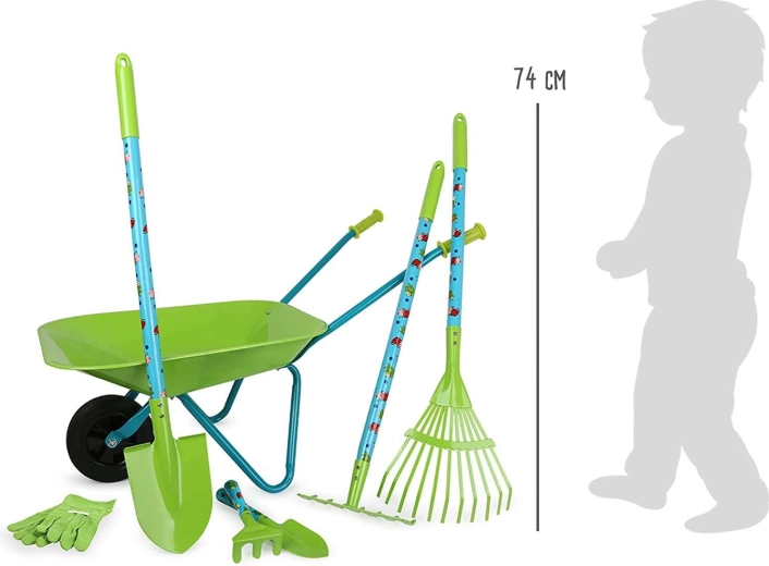 Este gran set de jardinería para niños SMALL FOOT incluye todo lo que un pequeño jardinero necesita: una carretilla estable, pala, rastrillo, rastrillo para hojas, rastrillo pequeño, palita y guantes de protección. La mayoría de las piezas son de metal, por lo que son firmes y duraderas, y al mismo tiempo ligeras y fáciles de manejar para las manos infantiles.