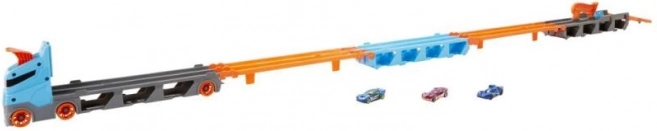 Con el transportador de carreras 2 en 1 de Hot Wheels puedes guardar y exhibir fácilmente hasta 20 cochecitos gracias a las pequeñas ventanas del remolque. Cuando llegue la hora de competir, el transportador se despliega y se convierte en una pista de carreras de 1,8 metros. Los vehículos permanecen visibles bajo la pista y la cabina del camión se transforma en un lanzador doble para dos coches.