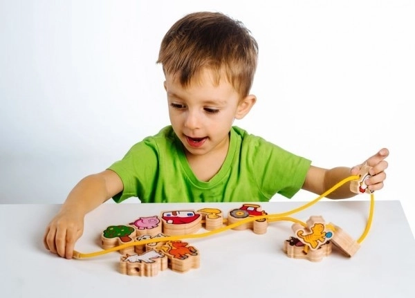 Enhebrar diferentes formas ayuda a los niños a mejorar la coordinación mano-ojo.