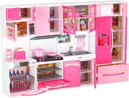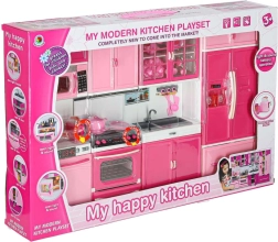 El paquete incluye una amplia gama de accesorios: ollas con tapas, sartén, tostadora con palanca móvil, vajilla, tazas, vasos, “caja de leche”, utensilios de cocina en ganchos y “cubitos de hielo”. Los armarios abatibles, el cajón extraíble y las estanterías enseñan a los niños el orden, desarrollan la motricidad fina y las habilidades sociales.