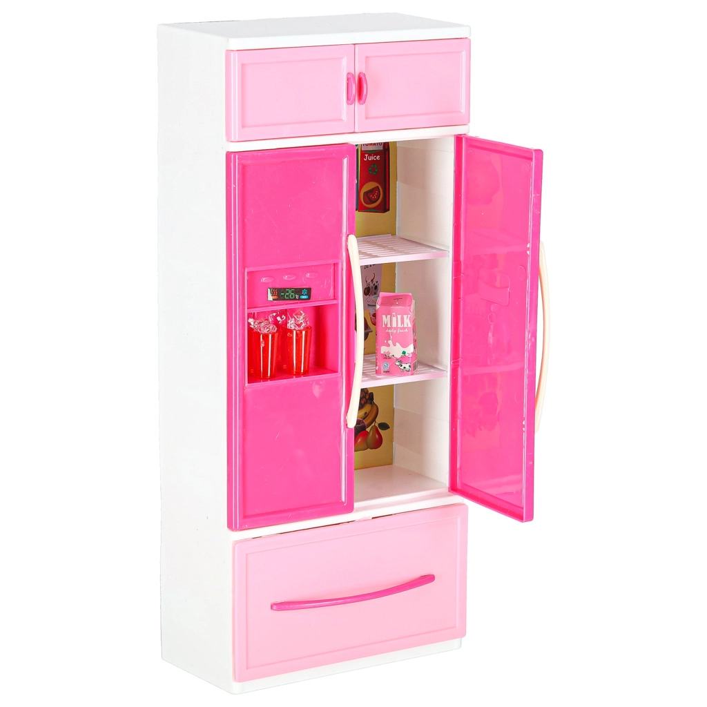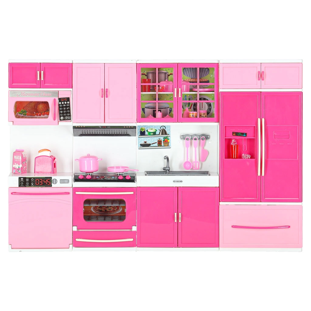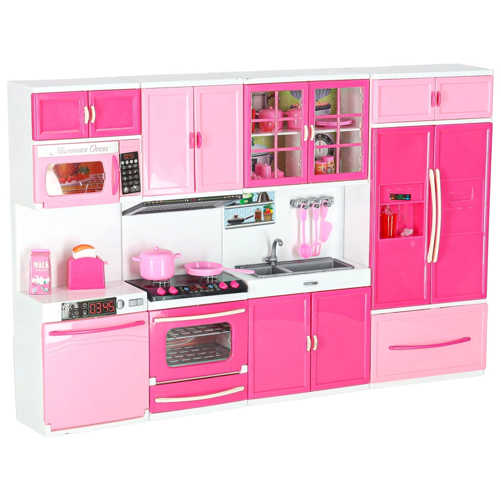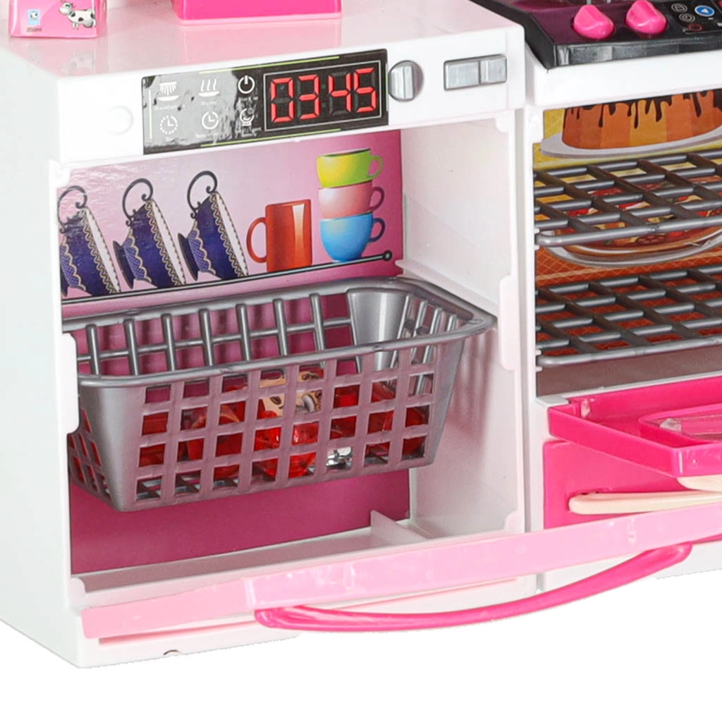 El conjunto incluye microondas y lavavajillas, placa con horno, vitrina con fregadero y una nevera con cajón. Los niños disfrutarán de un escenario completo de cocinar, hornear y limpiar.