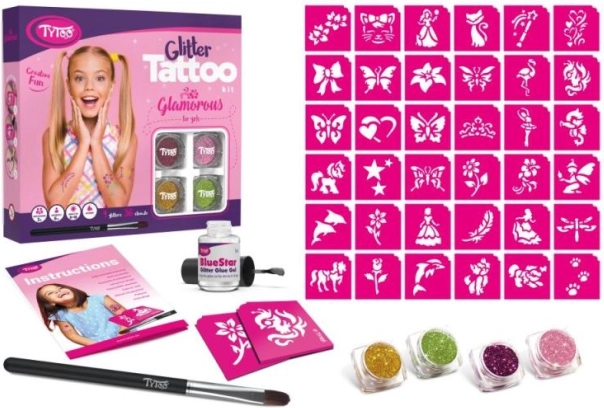Descubre la diversión creativa con el gran set de tatuajes brillantes TyToo Glamorous. Ofrece 36 diseños favoritos para niñas y 4 colores de purpurina para combinaciones infinitas. Los tatuajes son resistentes al agua, duran en la piel normalmente 8–18 días y se eliminan fácilmente con alcohol o aceite para bebés. También incluye piedras adhesivas y ojos móviles para una decoración original.