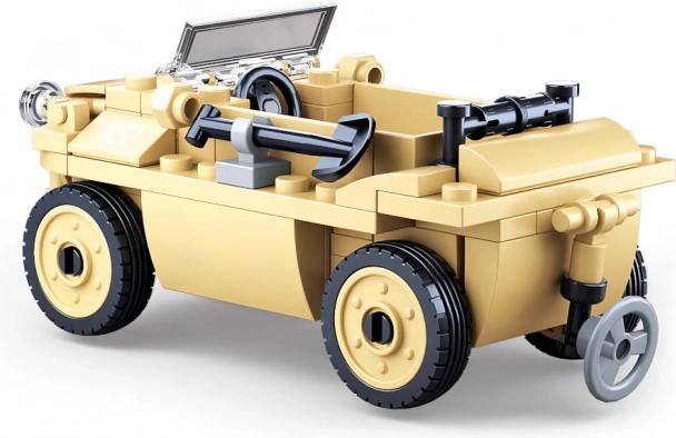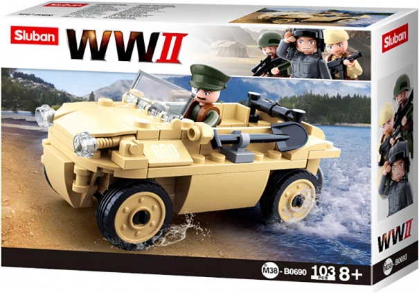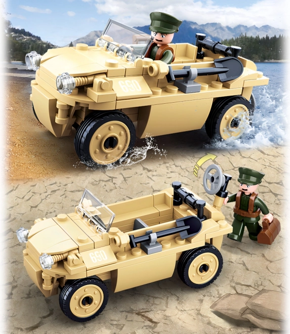El set ofrece una réplica detallada del vehículo anfibio alemán, enriquecida con elementos realistas como parabrisas y ruedas móviles.