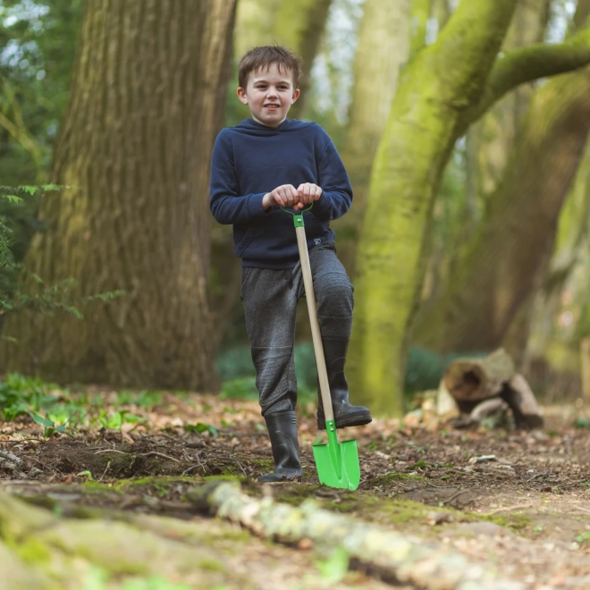 El asta de madera natural, lisa y resistente, se sujeta cómodamente y ayuda a los niños a cavar con seguridad y menos fatiga.