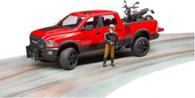- pick-up Ram, motocicleta Ducati Scrambler, figura del conductor