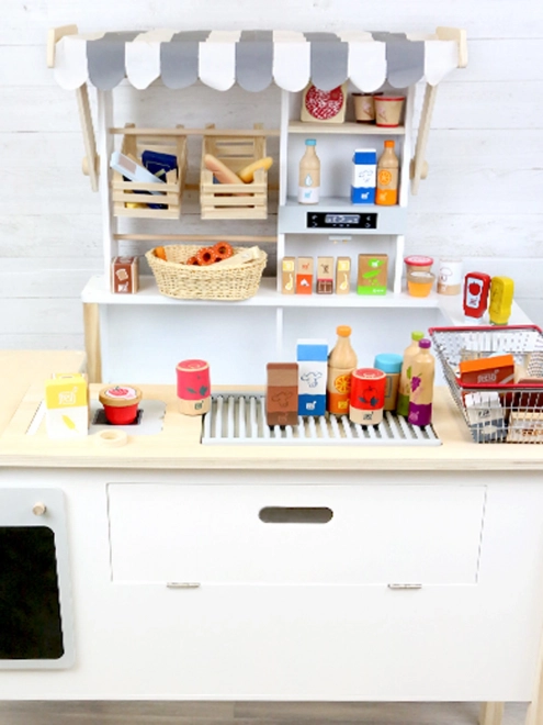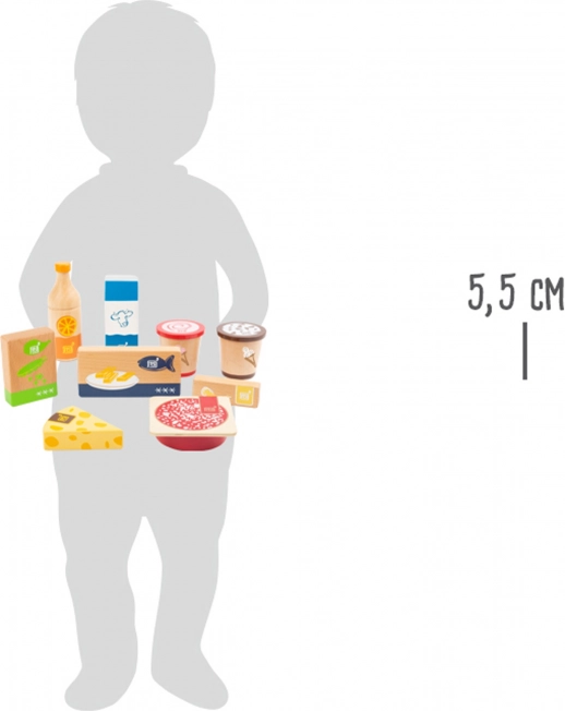 El set incluye zumo de naranja, dos envases de helado, un paquete de guisantes, palitos de pescado, mantequilla, queso, fiambre en lonchas y una caja de leche. Las impresiones realistas y el aspecto natural llaman la atención a primera vista. Gracias a la madera resistente, el conjunto es duradero y está listo para el juego diario.