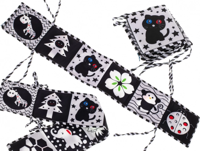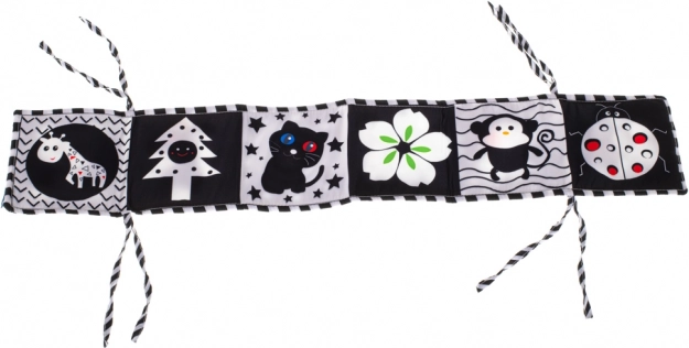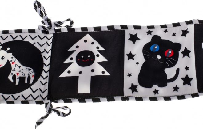 El libro sensomotor de alto contraste, diseñado como protector para la cuna, es una opción perfecta para los bebés que empiezan a descubrir el mundo. El libro en forma de acordeón puede fijarse fácilmente a la cuna con cintas, lo que aporta diversión y seguridad.