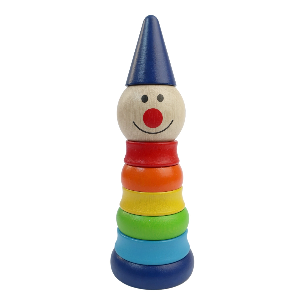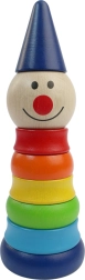Esta alegre pirámide de madera con forma de arlequín de la marca checa Detoa es el primer rompecabezas ideal para niños a partir de 1 año. Siete anillos de colores y una cabecita con gorrito se ensartan en una varilla firme y crean un divertido aspecto de arlequín que anima a los niños a apilar una y otra vez.