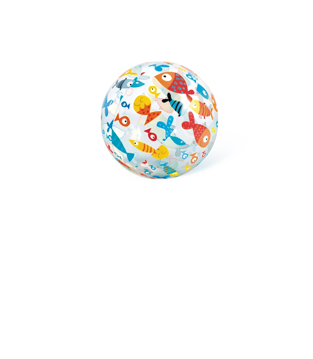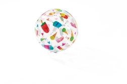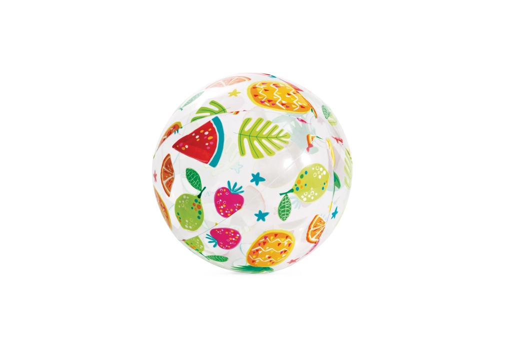 La pelota transparente está decorada con coloridos estampados de frutas, helados, peces y motivos marinos. El motivo se elige de forma aleatoria, pero siempre garantiza un aspecto alegre y buena visibilidad en el agua y en la playa.