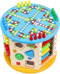 La parte superior con laberinto de cuentas se puede usar para entrenar el agarre y la motricidad fina; los paneles laterales ofrecen un clasificador de formas, engranajes, ábaco, números, laberinto y más actividades. La parte inferior oculta un juego de mesa “Ludo” con fichas y dados incluidos: ideal para la diversión familiar compartida.