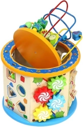 Descubre el versátil cubo educativo de madera 8 en 1, que ofrece largas horas de diversión y al mismo tiempo desarrolla la motricidad fina, el pensamiento lógico y el reconocimiento de colores, formas y números. El colorido recorrido de cuentas en la parte superior, el clasificador de formas, los engranajes, el ábaco, el reloj y el tablero de juego hacen de este juguete estable una elección ideal para un juego inteligente.