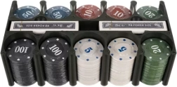El práctico soporte mantiene fichas y cartas en su lugar. Manipulación fácil para jugadores y “crupier”, y orden durante toda la partida.