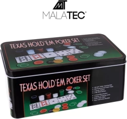 Completo set de póker TEXAS HOLD’EM en una práctica caja metálica que incluye 200 fichas con diferentes denominaciones, 2 barajas de cartas, un juego de fichas funcionales (Dealer, Small Blind, Big Blind) y una alfombrilla de juego verde. Todo está ordenado en un soporte para fichas, que garantiza el orden y facilita el transporte.