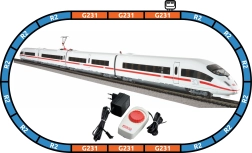 - Conjunto ICE 3 DB AG de 4 piezas (1 ud), vías curvas R2 con balasto 55412 (12 uds), rectas G231 con balasto 55401 (5 uds), recta G231 con alimentación 55406 (1 ud), base para pinza 55447 (1 ud), pinza de alimentación 55270 (1 ud), controlador analógico con fuente 55003 (1 ud)