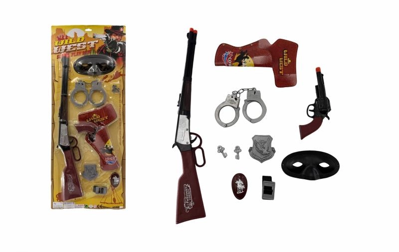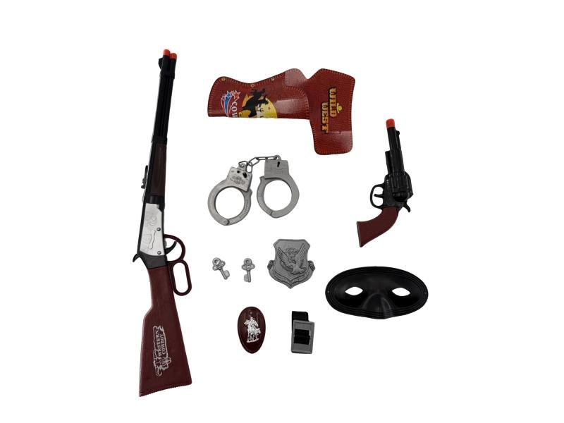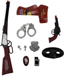 Convierte la habitación infantil en las praderas del Lejano Oeste. Este set de juego para pequeños vaqueros ofrece todo lo necesario para escenas llenas de aventuras: desde las esposas de “sheriff” hasta el “revólver” que completa el disfraz y la fantasía. Los accesorios, ligeros y fáciles de manejar, están adaptados a las manos de los niños.