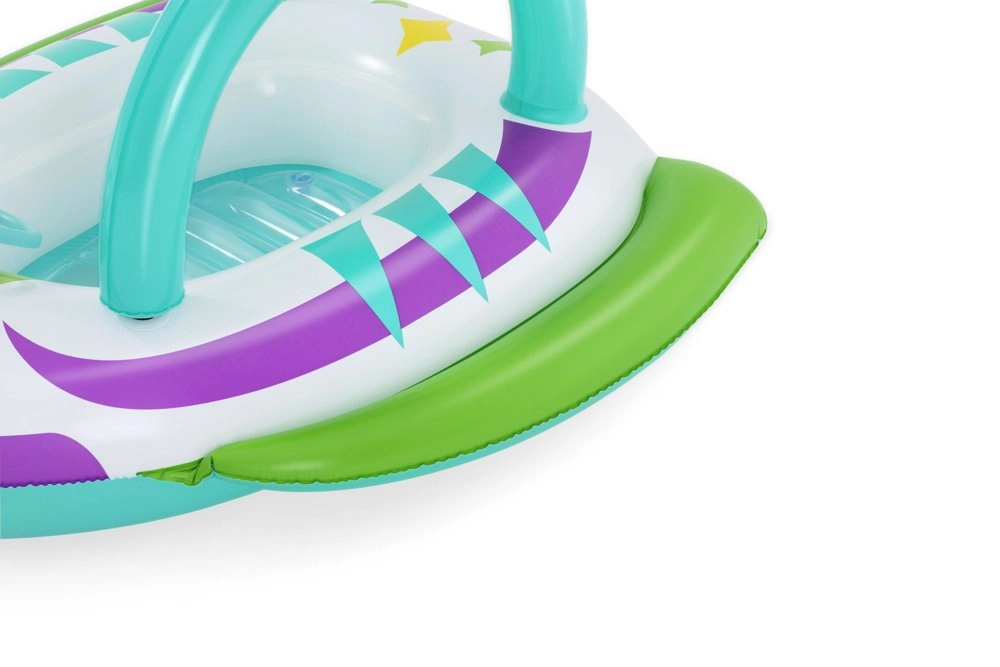 Gracias a su estructura estable de PVC resistente y a las asas cómodas, los niños pueden pasear de forma segura en aguas poco profundas bajo la supervisión de un adulto. El volante con claxon añade diversión interactiva y desarrolla la motricidad. Los gráficos “espaciales” y coloridos atraen la atención y fomentan la imaginación en los juegos acuáticos.
