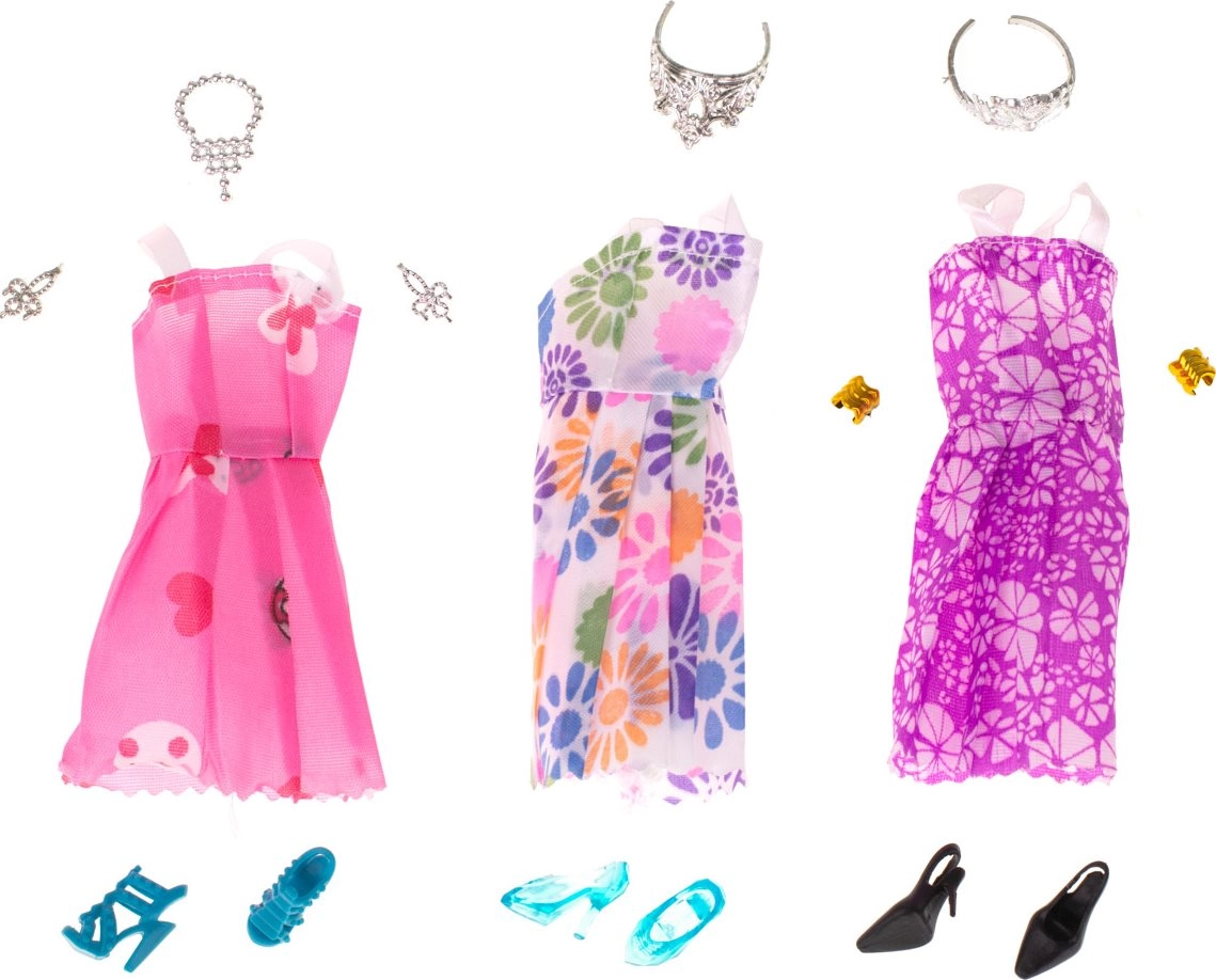 El set incluye 10 vestidos de diferentes colores, diseñados para adaptarse a cualquier muñeca. Además, incorporamos una amplia gama de accesorios como zapatos, bolsos y coronas, que brindan infinitas posibilidades de estilismo.
