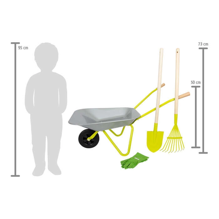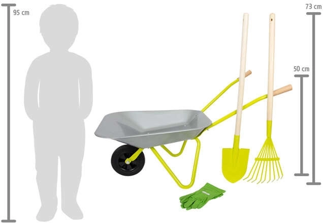 - Dimensiones prácticas: carretilla aprox. 79 × 36 × 50 cm, altura de los mangos 50 cm; longitud de la pala y el rastrillo aprox. 73 cm.