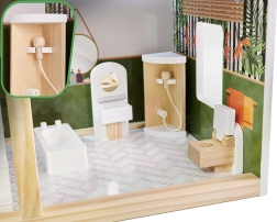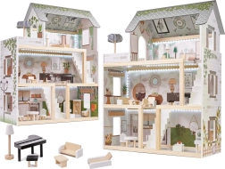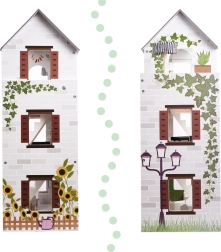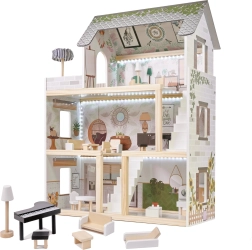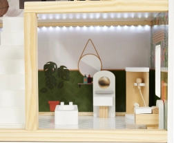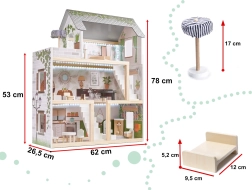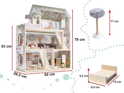 Descubre el mundo boho encantador con la casa de muñecas de madera LULILO FLORO de 78 cm de altura. La estructura de tres niveles con terraza, accesorios detallados y iluminación LED crea un ambiente acogedor para horas de juego creativo e imaginativo. La madera finamente lijada, los colores pastel y el amplio equipamiento la convierten en una preciosa decoración para el dormitorio infantil y en un regalo perfecto.