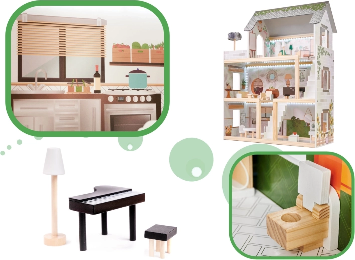 La casa LULILO FLORO en un delicado estilo boho combina aspecto natural, detalles elegantes y elementos funcionales para pequeños narradores. A los niños les encantarán las cuatro estancias amuebladas —cocina, baño, sala de estar y dormitorio— y la amplia terraza con tumbona y sombrilla. La iluminación LED integrada realza la atmósfera de juego tanto de día como de noche.
