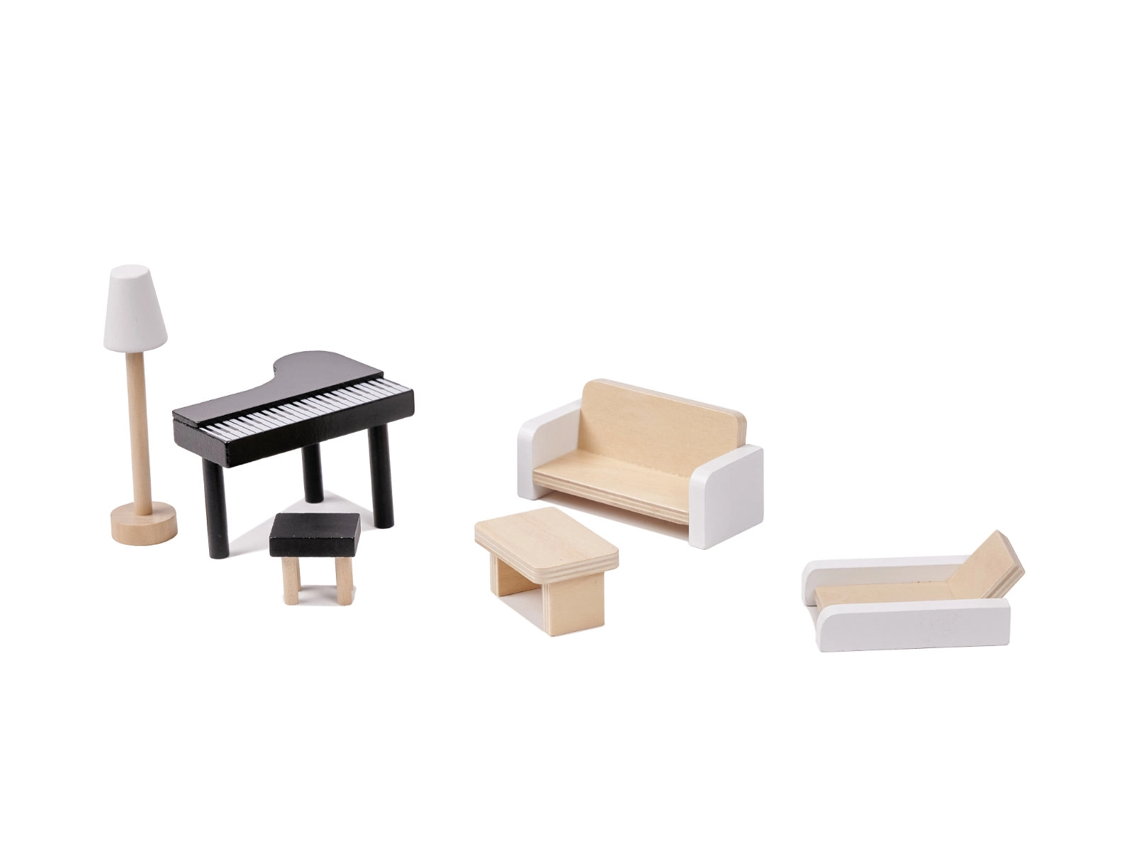 Incluye piano con taburete, sofá, sillón, mesas, lámpara, TV, juego de comedor, cama, equipamiento de baño y accesorios de terraza, todo coordinado en estilo boho.