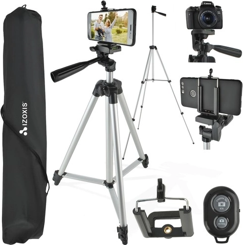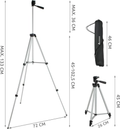 El trípode es ideal para fotografía y videografía con cámara, teléfono o videocámara digital. Dispone de una rosca universal de 1/4" y un soporte compatible para diferentes dispositivos. Este práctico y ligero accesorio es fácil de transportar, lo que lo convierte en un compañero ideal de viaje.