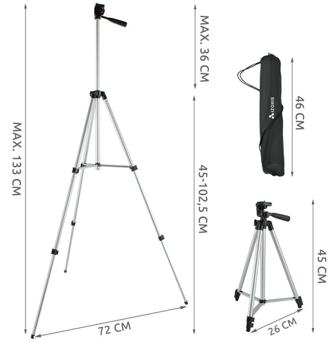 La rótula del trípode es ajustable en tres ejes, lo que permite un ajuste preciso del ángulo. La estructura metálica estable con componentes de plástico garantiza un rendimiento óptimo y una larga vida útil.