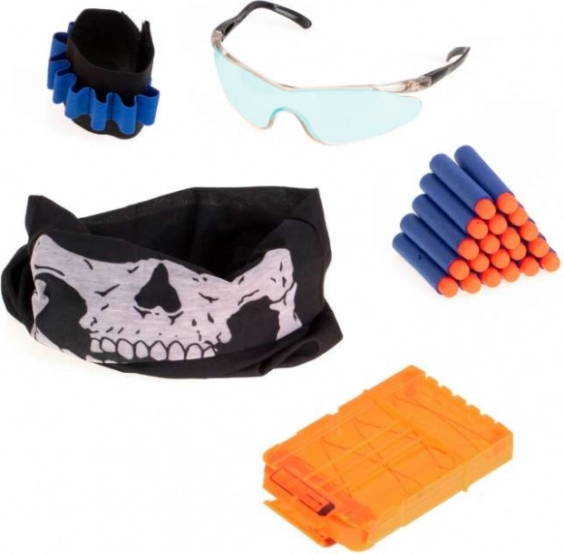 Completo set infantil para dardos de espuma: cómodo chaleco táctico con soportes y bolsillos, 20 dardos de espuma, cargador de plástico para 6 dardos, muñequera para munición, gafas de protección azules y bandana. El chaleco cuenta con malla transpirable, talla infantil universal y cierre de velcro ajustable para un uso cómodo.