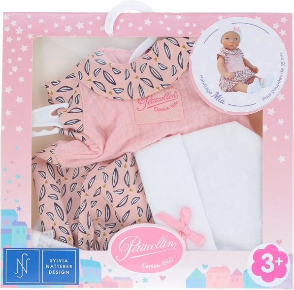 Conjunto Mia para muñecas de Petitcollin aporta elegancia francesa y estampados únicos. Este set es ideal para muñecas de 35 cm de altura e incluye un mono, un gorrito y calcetines.