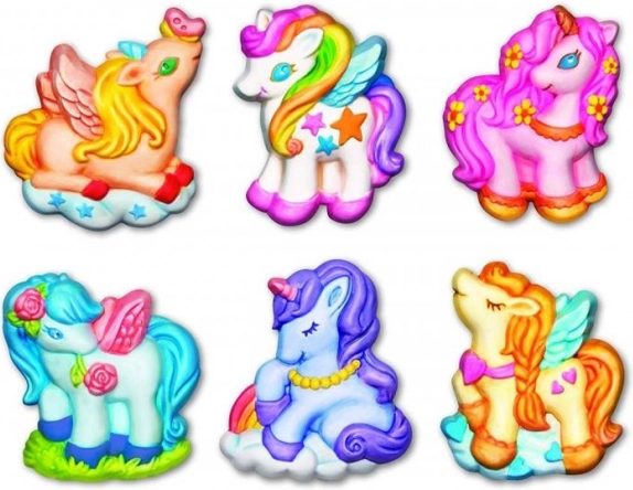 Crea y pinta imanes de yeso brillantes para la nevera o broches con la forma de 6 adorables unicornios. Ideal para desarrollar la creatividad de los niños.